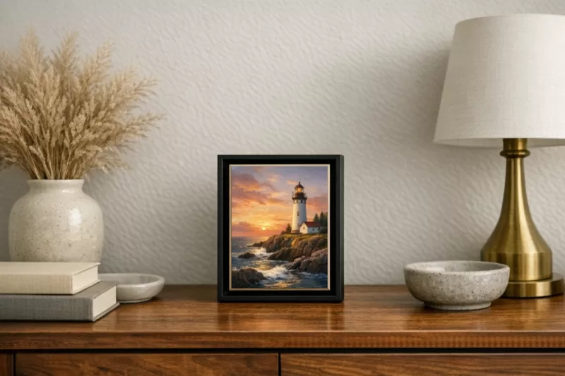 With small 5x7 pieces, the frame should support the artwork without overpowering it. Think about where it will live and how it will be viewed—stand-alone as a small accent, or as part of a grouped wall.