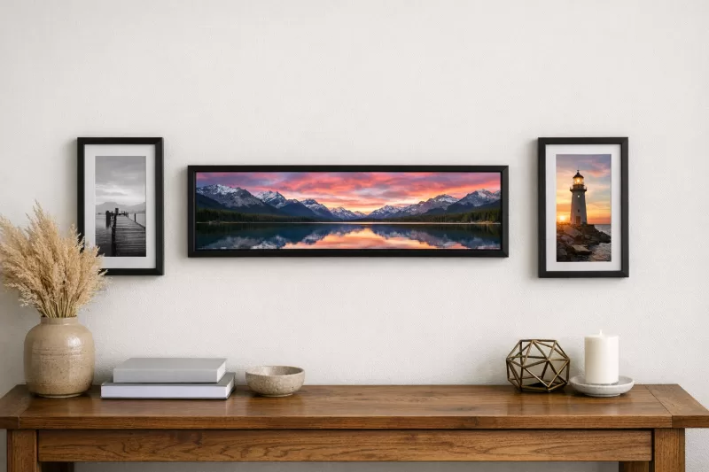 Orientation matters with this size. Most 5x15 pieces are displayed horizontally for landscapes, skylines, and wide group shots, but some designs work vertically for stacked strip-style compositions. Choose the display style that suits where it will live—wall hanging for hallway runs and above furniture, or tabletop display for shelves and desks—and consider glare reduction if the frame will face bright light.