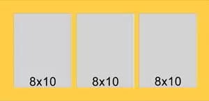 3 hole collage mat with all windows at 7 3/4 x 9 3/4. This will fit pictures that are 8 x 10.