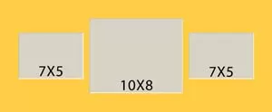 3 hole collage mat with 2 window holes at 6 3/4 x 4 3/4 and one at 9 3/4 x 7 3/4. This will fit pictures that are 7 x 5 and 10 x 8.
