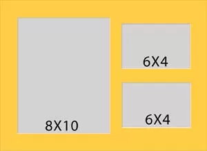 3 hole collage mat with 2 window holes at 5 3/4 x 3 3/4 and one at 7 3/4 x 9 3/4. This will fit pictures that are 6 x 4 and 8 x 10.