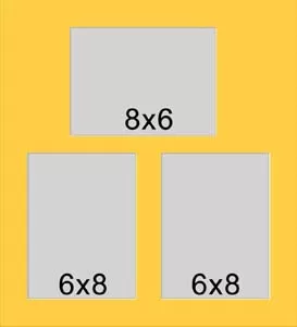 3 hole collage mat with 2 window holes at 5 3/4 x 7 3/4 and one at 7 3/4 x 5 3/4. This will fit pictures that are 6 x 8.