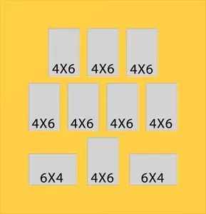 10 hole collage mat with eight windows at 3 3/4 x 5 3/4 and two at 5 3/4 x 3 3/4. This will fit pictures that are 4 x 6.