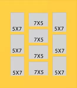 10 hole collage mat with si x windows at 4 3/4 x 6 1/2 and four at 6 3/4 x 4 3/4. This will fit pictures that are 5 x 7.