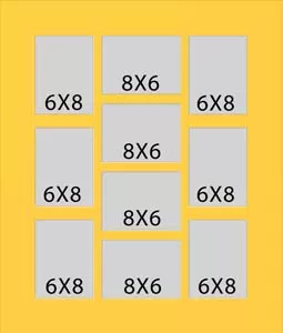 10 hole collage mat with si x windows at 5 3/4 x 7 3/4 and four at 7 3/4 x 5 3/4. This will fit pictures that are 6 x 8.