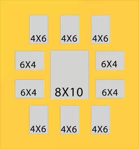 11 hole collage mat with si x windows at 3 3/4 x 5 3/4 and four at 5 3/4 x 3 3/4 and one at 7 3/4 x 9 3/4. This will fit pictures that are 4 x 6 and 8 x 10.