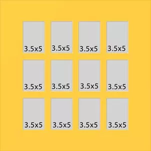12 hole collage mat with all windows at 3 1/4 x 4 3/4. This will fit pictures that are 3 1/2 x 5.