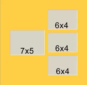 4 hole collage mat with 3 window at 5 3/4 x 3 3/4 and one at 6 3/4 x 4 3/4. This will fit pictures that are 6 x 4 and 7 x 5.