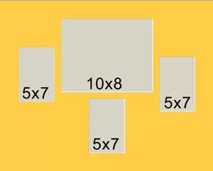 4 hole collage mat with 3 window at 4 3/4 x 6 3/4 and one at 9 3/4 x 7 3/4. This will fit pictures that are 5 x 7 and 10 x 8.