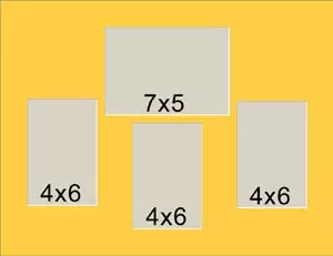 4 hole collage mat with 3 window at 3 3/4 x 5 3/4 and one at 6 3/4 x 4 3/4. This will fit pictures that are 4 x 6 and 7 x 5.