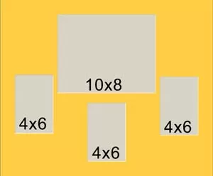4 hole collage mat with 3 window at 3 3/4 x 5 3/4 and one at 9 3/4 x 7 3/4. This will fit pictures that are 4 x 6 and 10 x 8.