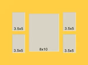 5 hole mat with four windows at 3 1/4x4 3/4 and one at 7 3/4x9 3/4. This will fit pictures that are 3 1/2x5x and 8x10.