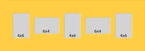 5 hole mat with three windows at 3 3/4x5 3/4 and two at 5 3/4x3 3/4. This will fit pictures that are 4x6.