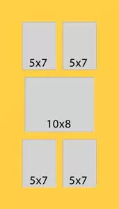 5 hole mat with four windows at 4 3/4x6 3/4 and one at 9 3/4x7 3/4. This will fit pictures that are 5x7 and 10x8.