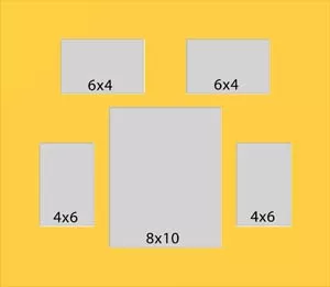 5 hole mat with two windows at 5 3/4x3 3/4 and two at 3 3/4x5 3/4 and one at 7 3/4x9 3/4. This will fit pictures that are 4x6 and 8x10.