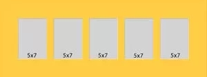 5 hole mat with all windows at 4 3/4x6 3/4. This will fit pictures that are 5x7.