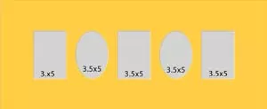 5 hole collage mat with all windows at 3 1/4 x 4 3/4. This will fit pictures that are 3 1/2 x 5.