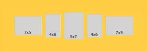 5 hole collage mat with two windows at 4 3/4 x 6 3/4 and two at 3 3/4 x 5 3/4 and one at 4 3/4 x 6 3/4. This will fit pictures that are 5 x 7 and 4 x 6.