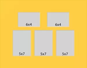 5 hole collage mat with three windows at 4 3/4 x 6 3/4 and two at 5 3/4 x 3 3/4. This will fit pictures that are 5 x 7 and 6 x 4.