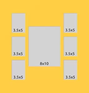 7 hole mat with six windows at 3.25x4.75 and one at 7.75x9.75. This will fit pictures that are 3.5x5 and 8x10.