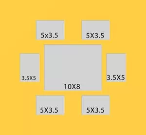 7 hole mat with four windows at 4.75x3.25 two at 3.25x4.75 and one at 9.75x7.75 This will fit pictures that are 8x10 and 3.25x5.