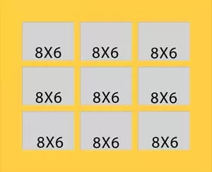 9 hole collage mat with all windows at 7 3/4 x 5 3/4 This will fit pictures that are 8 x 6.