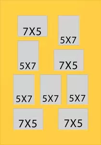 9 hole collage mat with five windows at 4 3/4 x 6 3/4 and four at 6 3/4 x 4 3/4. This will pictures that are 5 x 7.