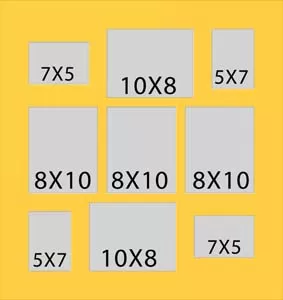 9 hole collage mat with three windows at 7 3/4 x 9 3/4 and two at 9 3/4 x 7 3/4 and two at 6 3/4 x 4 3/4 and two at 4 3/4 x 6 3/4. This will pictures that are 8 x 10 and 5 x 7.