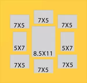 9 hole collage mat with si x windows at 6 3/4 x 4 3/4 and two at 4 3/4 x 6 3/4 and one at 8 1/4 x 10 3/4. This will fit regular typing paper or pictures that are 8 1/2 x 11 and 5 x 7.