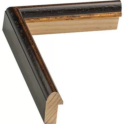 This deep brown and copper wood picture frame features a copper colored inner lip, followed by a half-circle convex protrusion that spans nearly the width of the profile, followed by a small step on the outside edge. The profile width is 1”, and the total depth of the frame including the face of the profile is 2” deep. The rabbet depth is 1 1/8”.