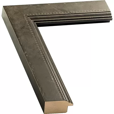 This distressed metallic wood picture frame offers an aged, vintage look and features a series of small steps along the inner lip, followed by an indented reverse bead pattern along an otherwise flat profile face. The width of this profile is 1-3/4”, and the rabbet depth is 3/8”.