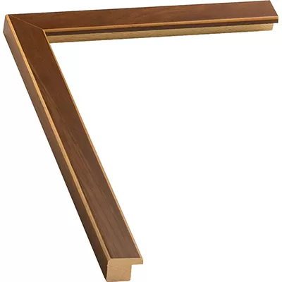 This brown wood picture frame moulding is made in Italy, and offers a clean, simple, unassuming look for small to medium-sized artwork, especially photographs and fine art on paper. The profile is 7/8” wide, and features a thin, tan line running along both the inside and outside edges of the profile face. The flat profile face offers the look of a warm brown grain pattern over a wood substrate.