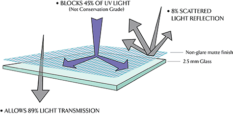 Non-Glare glass (AKA reflection control glass) enhances artwork with etched matte-like finish that scatters light to minimize glare.